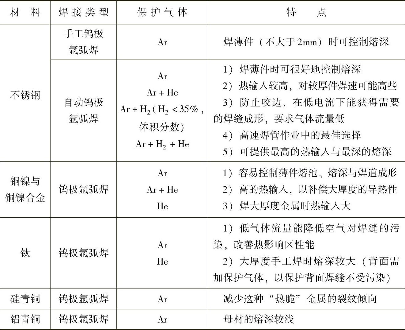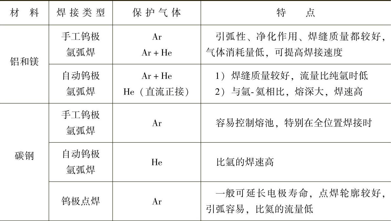表9-3 不同材料氩弧焊时保护气体的保护特点