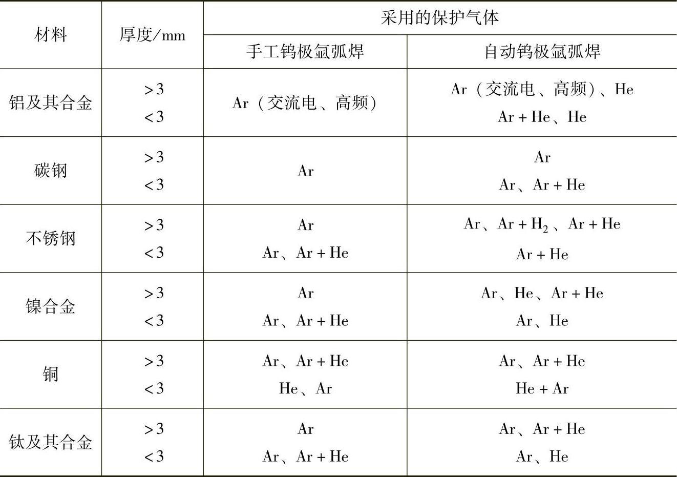 不同材料钨极氩弧焊保护气体的选用见表9-2。