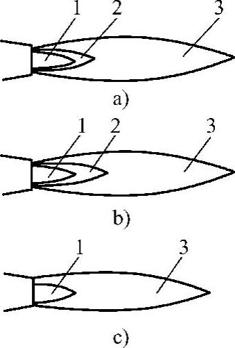 根据混合比的大小,可得到性质不同的三种火焰:中性焰、氧化焰和碳化焰,如图10-33所示。