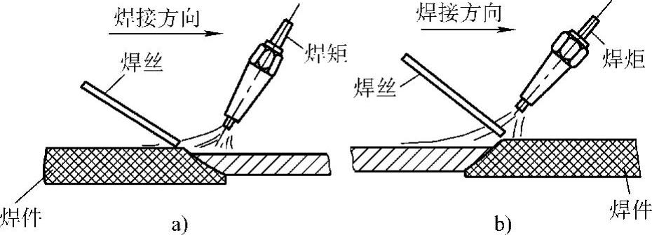 左焊法(见图10-35b)时,焊炬火焰背着焊缝面指向焊件未焊部分,并且焊炬跟着焊丝走。焊接时,焊工能够很清楚地看到熔池的后部凝固边缘,容易获得宽度和高度较均匀的焊缝,由于焊炬火焰指向焊件未焊部分,对金属有着预热作用,这种方法容易掌握,应用最普遍。缺点是焊缝易氧化,冷却较快,热量利用率较低,因此适用于薄板的焊接。