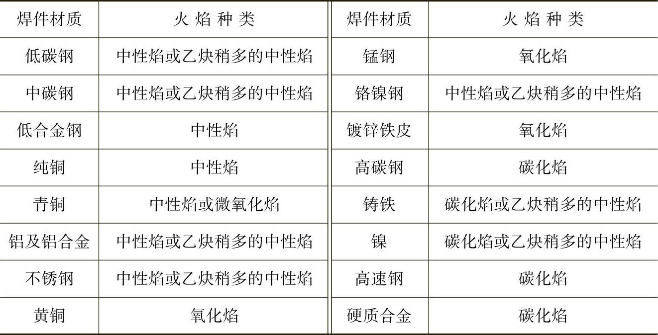 1)火焰的种类。各种不同材料的焊件,应采用的火焰种类见表10-14。