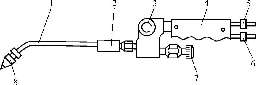 1—混合管 2—射吸管 3—氧气调节阀 4—手柄 5—氧气管接头 6—乙炔管接头 7—乙炔调节阀 8—焊嘴
