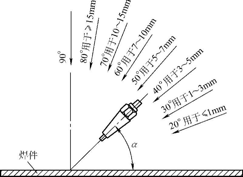 图10-34 焊炬倾斜角与焊件厚度的关系
