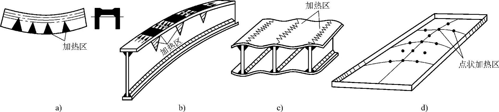 (2)火焰线状加热矫正 火焰沿着直线方向或者同时在宽度方向作横向摆动的移动,形成均匀线状加热。如图11-12所示为火焰线状加热的几种形式。在线状加热矫正时,加热线的横向收缩大小纵向收缩,加热线的宽度越大,横向收缩也越大。所以,在线状加热矫正时要尽可能发挥加热线横向收缩的作用。加热线宽度一般取钢板厚度的0.5~2倍左右。这种矫正方法多用于变形较大或刚度较大的结构,也可用于矫正钢板。