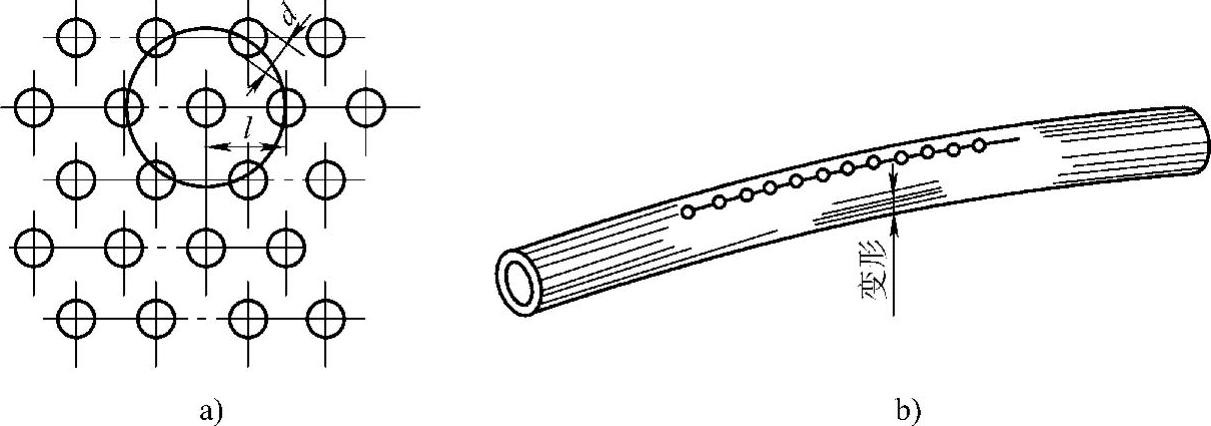 (1)火焰点状加热矫正 图11-11为火焰点状加热矫正钢板和钢管的实例。如图11-11a所示为钢板(厚度在8mm以下)波浪变形的点状加热矫正,其加热点直径d一般为15~30mm,点间距离l应随变形量的大小而变,残余变形越大,l越小,一般在50~100mm变动。为提高矫正速度和避免冷却后在加热处出现小泡突起。往往在加热完一个点后,立即用木槌击打加热点及其周围,然后浇水冷却。