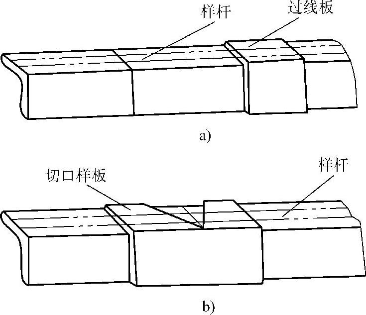 (2)中间切口或异型端口号料 有中间切口或异型端口的型钢号料时,首先利用样杆或卷尺确定切口位置,然后利用切口处形状样板,划出切口线,如图12-27b所示。