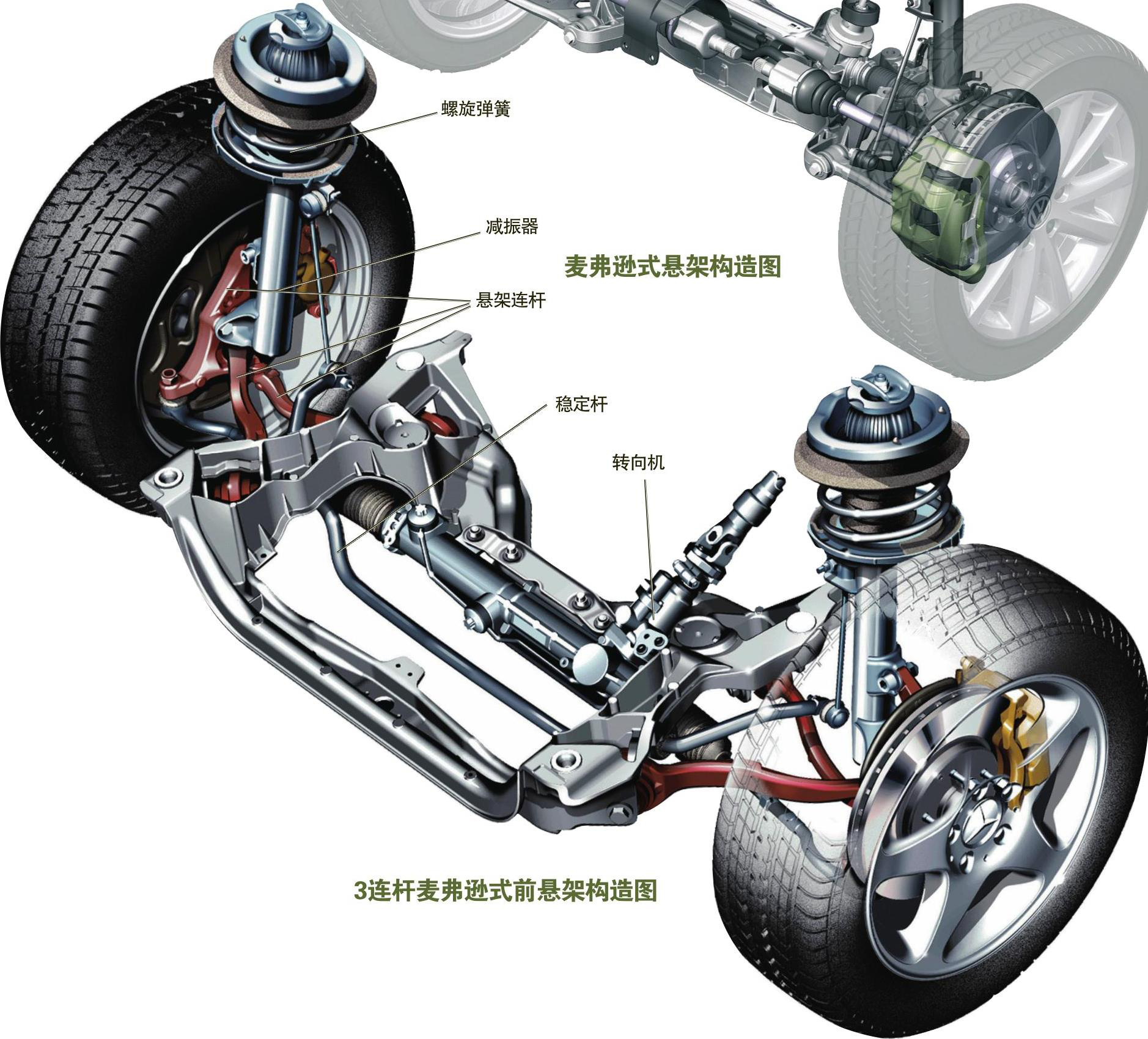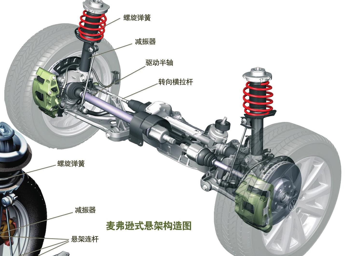 上部的减振支柱集成了弹簧和减振器,这根支柱不仅承担车体、减振的任务,而且还要承受车轮上端的横向力。下部的A臂则可以承担车轮下端的横向力和纵向力。