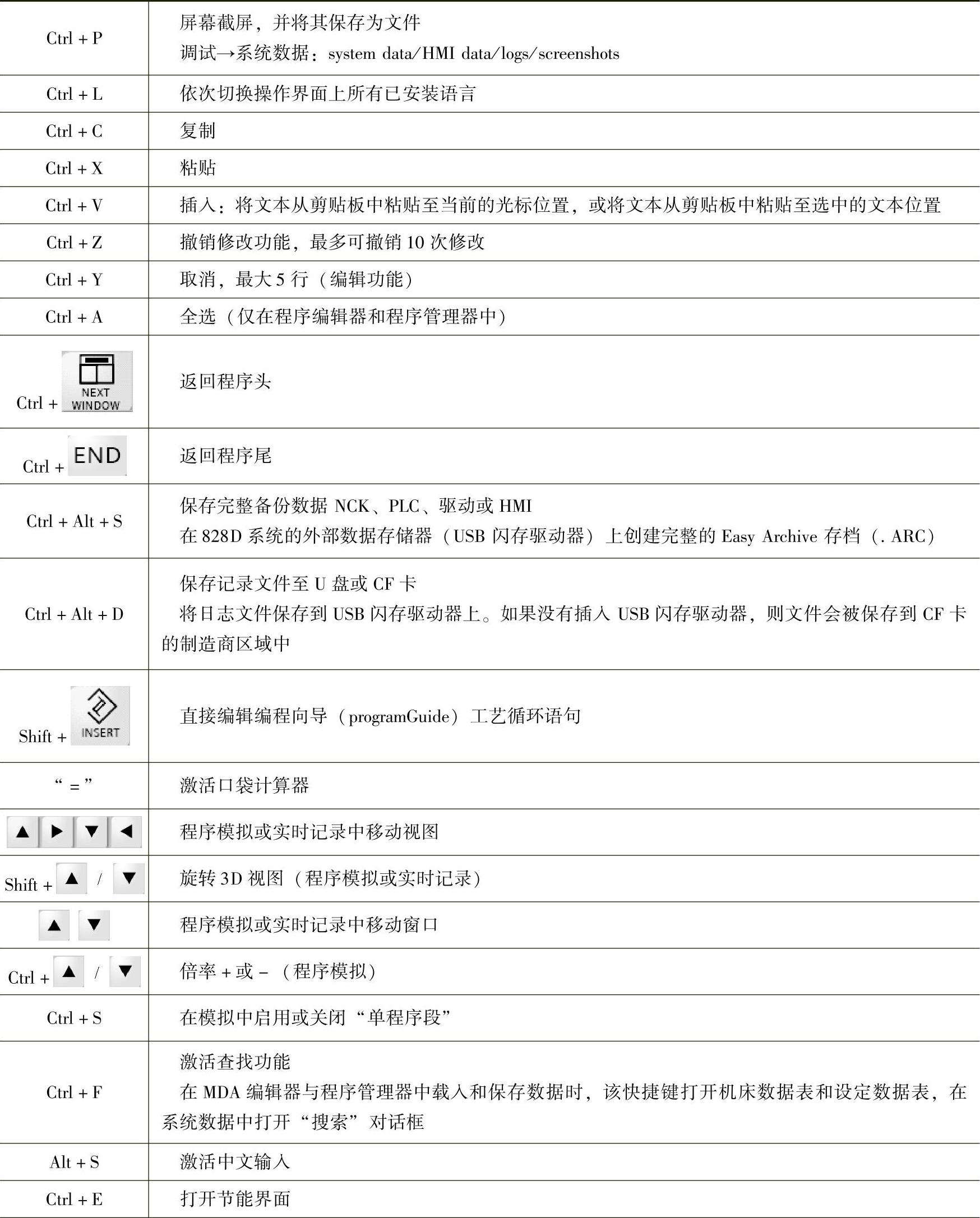 SINUMERIK 828D数控系统为提高信息的输入速度,还允许使用快捷键方式对系统进行操作,系统操作快捷键见表2-3。