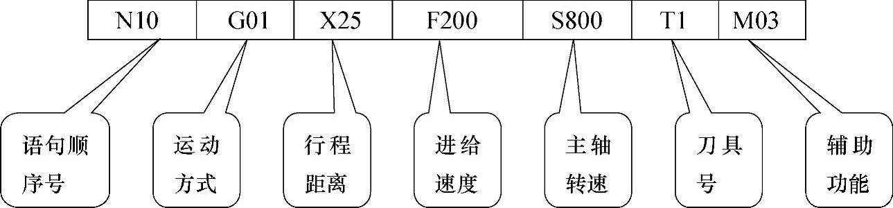 (1)程序语句 程序语句又称程序段。一个程序段表示一个完整的加工工步或动作,包含了执行一个加工工步的数据。每个刀具轨迹运动的工艺数据要作为单独的指令写出,由这种先后排列的指令便可组成一条完整的加工工步程序。