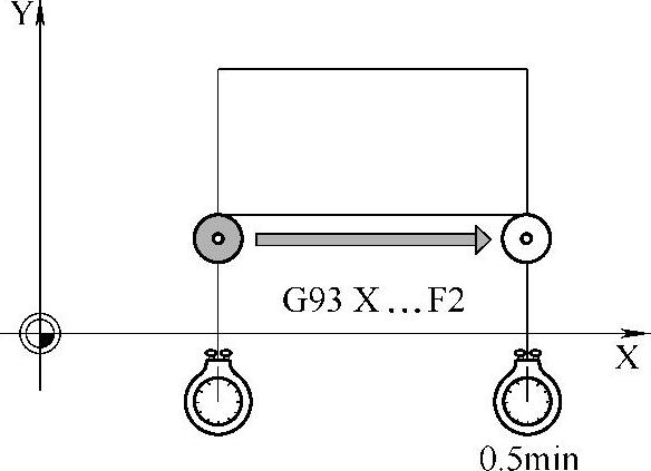 N10 G93 G1 X100 F2 ;编程的轨迹行程在0.5min内运行完毕,如图3-18所示。