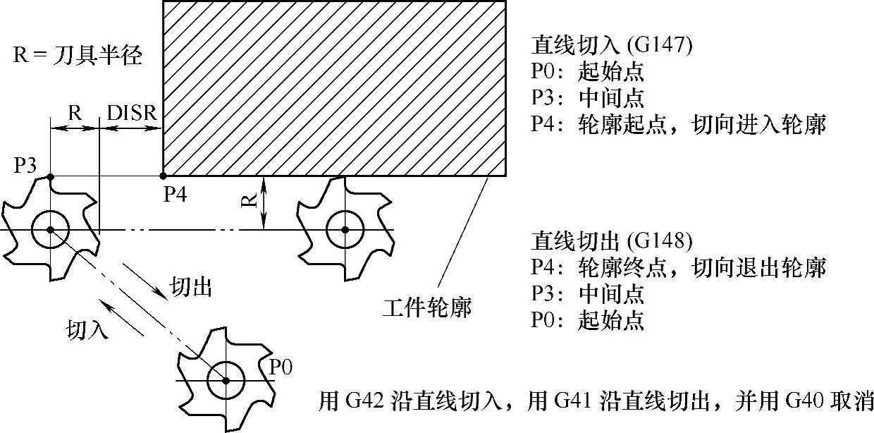 DISR=;当沿直线切入和切出(G147/G148)时为铣刀边缘(刀沿)到工件轮廓起始点的距离,在刀具半径补偿生效时为刀具中心点距轮廓起始点距离(等于刀具半径和给定的DISR值的总和)。当沿圆弧切入和切出(G247、G347/G248、G348)时为刀具中心点轨迹编程的半径值。