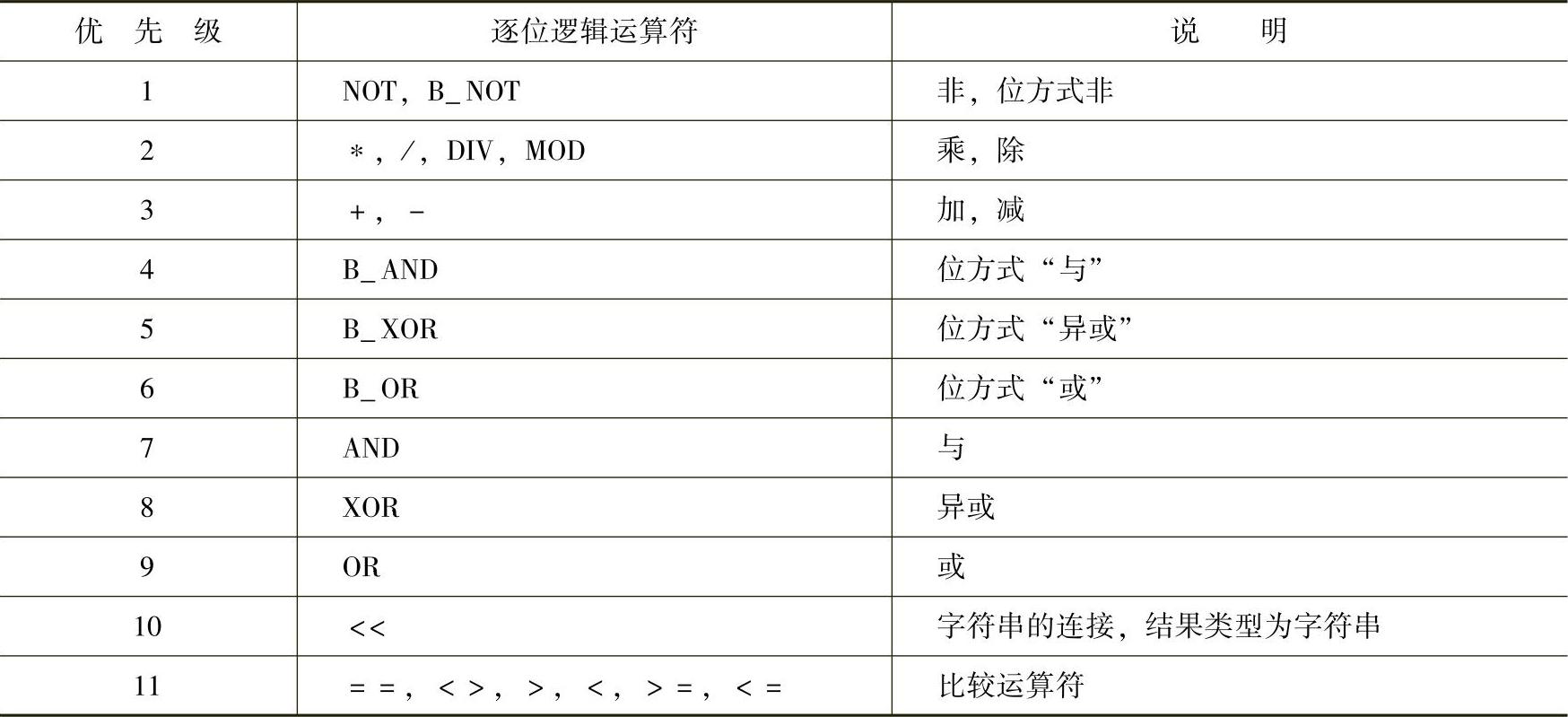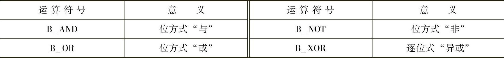 (3)逻辑运算 用于将真值联系起来。逻辑运算只能用于BOOL型变量。通过内部类型转换也可将其用于CHAR、INT和REAL数据类型,见表6-7。