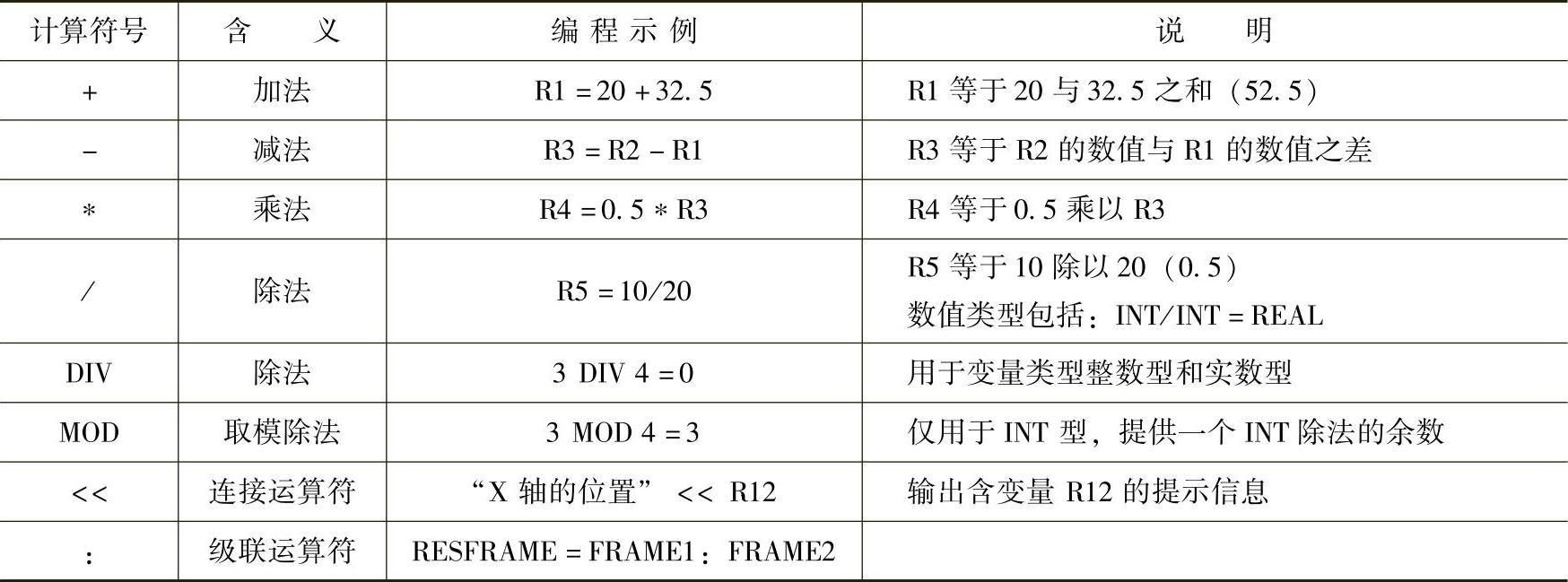 (1)数值计算 表达式运算是现代数控系统指令表达的一种常用方法。在数值计算中既有常量计算,也有R参数和实数型变量计算,计算时也遵循通常的数学运算规则。同时,整数型和字符型数值间的计算也是允许的。常用的运算形式见表6-5。