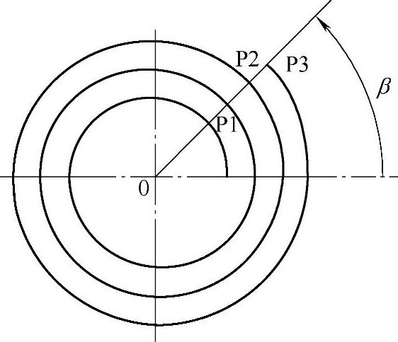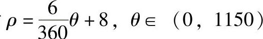 这条基于极坐标原点的、起始极径为8mm、螺距为6mm的螺旋线,极角θ的取值范围θ∈(0,1150),十进制度数。做连接极点O与螺旋线终点P3的辅助直线,分别交螺旋线于P1点、P2点和P3点。观察图示轨迹可以看到: