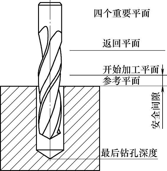 为了表述方便,本书对工艺循环中涉及的四个特定的平面位置进行如下定义,并以钻孔加工循环为例说明,如图7-1所示。
