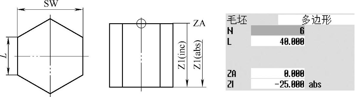 (1)创建毛坯外形 多边形毛坯是边沿数大于或等于3的正多边形外形体毛坯。按照毛坯外形的特点,毛坯上表面外形以边沿数量(N)确定;外形尺寸(边沿长度)将依据边沿数量用(SW)或(L)以对称法标注的数据确定,高度尺寸(Z1)则可以使用绝对尺寸(abs)也可以使用相对尺寸(inc)方式确定,如图7-4所示。