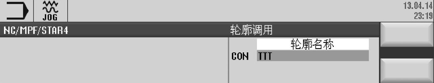 ①轮廓名称。在轮廓选择方式下,第二个参数项名称为“CON”。只需在CON一栏填写轮廓的名字即可。当然,该轮廓的名字是不能随意填写的。例如,如果在这里填写轮廓名称为“TTT”,就必须先在主程序的结束符M30之后,预先用轮廓编辑器建立一个名为“TTT”的轮廓图形轨迹;否则,系统在执行相关轮廓处理的循环时,将找不到该轮廓,如图7-42和图7-43所示。