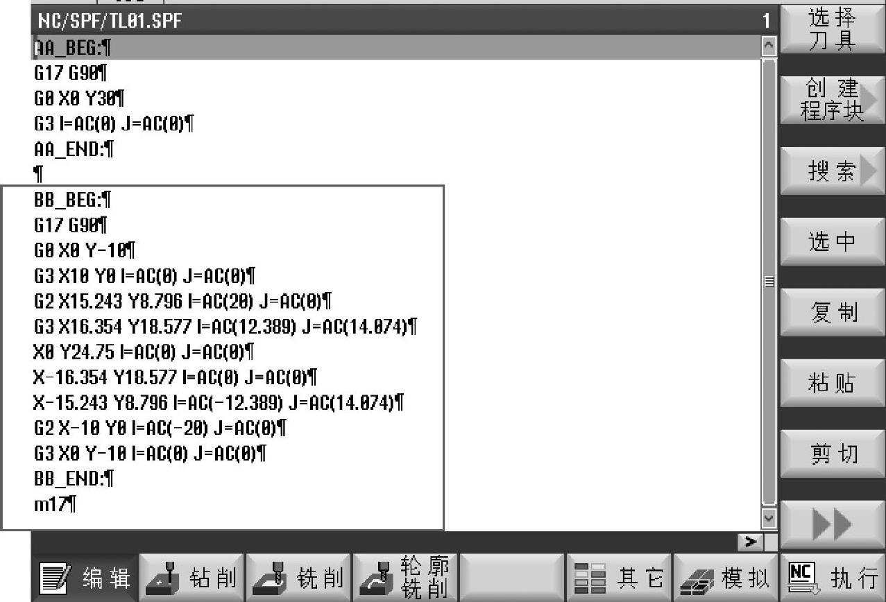 使用标签的方法设置轮廓需要将轮廓描述部分的程序段放置在主程序后面。但是需要在轮廓程序段的开头和结束部分加入标记。标记由标记名和冒号构成,标记名可以是一个字符串。一般的命名规则是:前两个字符为字母,其后可以跟随字母、数字和下划线等符号。图7-45所示的示例为:在轮廓程序段的第一行用“AA_BEG:”作为轮廓开始的标记,而在轮廓程序段的最后一行用“AA_END:”作为轮廓结束的标记。