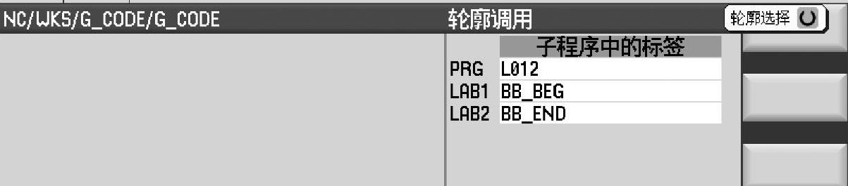 ④子程序中的标签。选择子程序中的标签方式,是指可以将多个轮廓程序段写在同一个子程序当中,甚至可以直接调用其他主程序中带有标记的轮廓程序段。首先,在轮廓调用时必须在PRG一栏中正确填写包含轮廓程序段的子程序名称,如L012。然后,在LAB1和LAB2后面分别填上子程序中被调用程序段的起止标记名,如BB_BEG,BB_END,如图7-48所示,子程序中的标签方式下的轮廓编辑示例如图7-49所示。