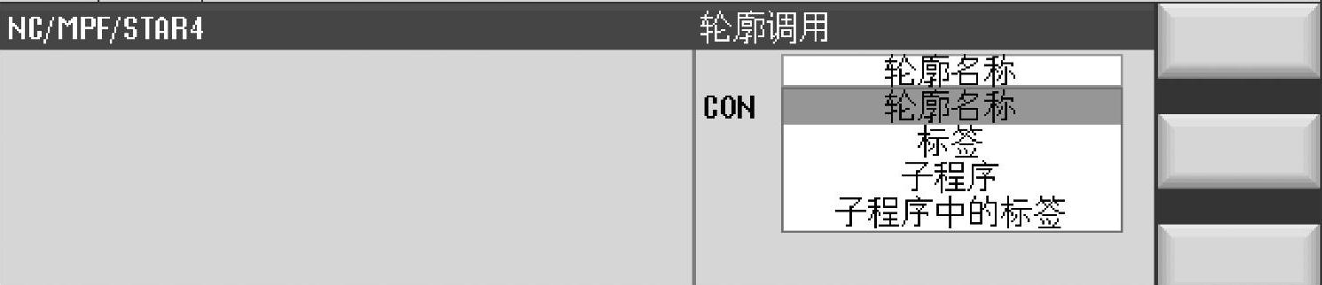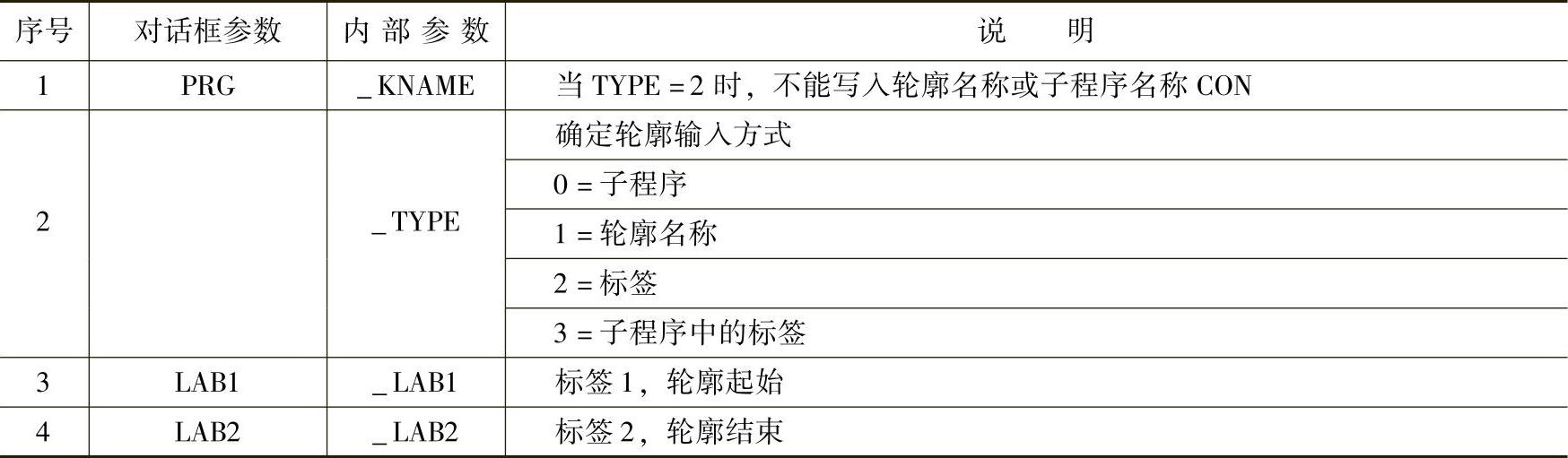 第一个参数是用来指示轮廓的位置,图7-41中有四种选择轮廓的方式可以使用:轮廓名称、标签、子程序和子程序中的标签。对应第一个参数项内容,第二个参数则有着一定的对应关系,简述如下。