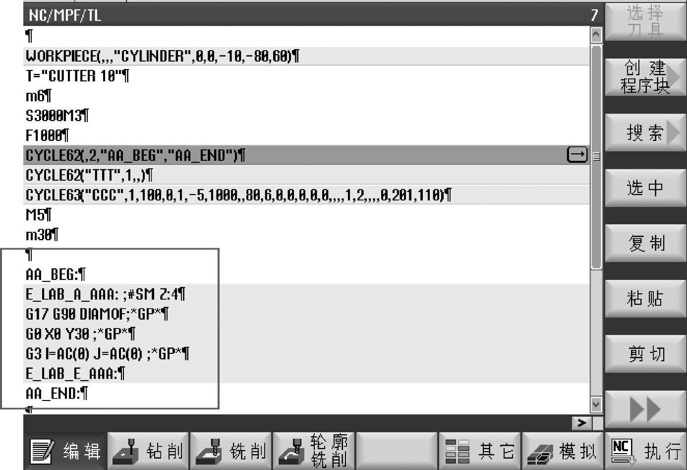 ②标签。使用标签的方法设置轮廓,在主程序中CYCLE62循环指令编译后的程序格式参数列表中,LAB1处应该填写轮廓开始的标记“AA_BEG”,而LAB2处应该填写轮廓结束的标记“AA_END”,如图7-44所示。填写时有两点需要注意:第一,此处填写的是标记名而不是标记,没有冒号;第二,标记名是区分大小写字母的。