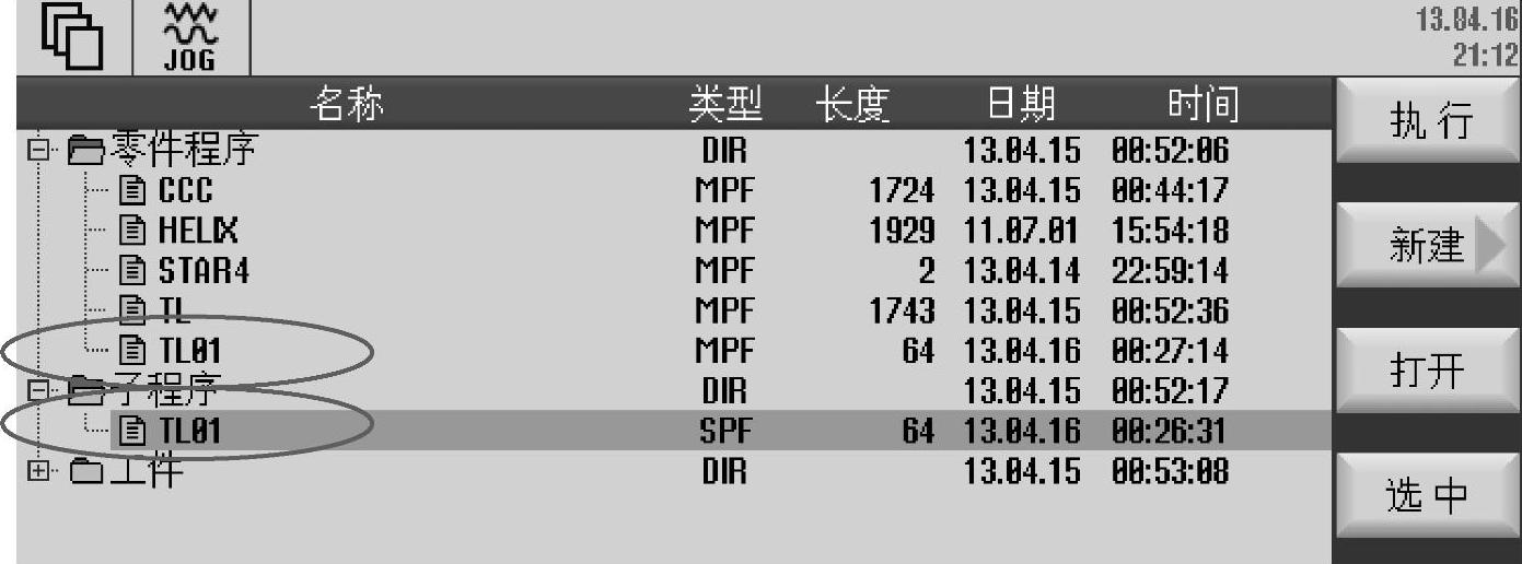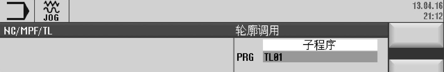 ③子程序。选择子程序方式,则是在子程序里编写轮廓程序段,也是描述轮廓中最常用的方法。轮廓子程序可以放在专门的子程序目录中,但是程序名的扩展名必须是“.SPF”。轮廓子程序也可以放在零件程序目录中,虽然其后缀名为“.MPF”,但是仍然可以作为子程序被其他的主程序调用。需要注意的是,如果有两个同名的轮廓子程序,一个以“.MPF”为扩展名,存放在零件程序目录中,而另一个以“.SPF”为扩展名,存放在子程序目录中,则优先被调用的是存放在零件程序目录下的同名主程序。子程序方式下输入子程序名程示例如图7-46所示,子程序方式下的轮廓编辑示例如图7-47所示。