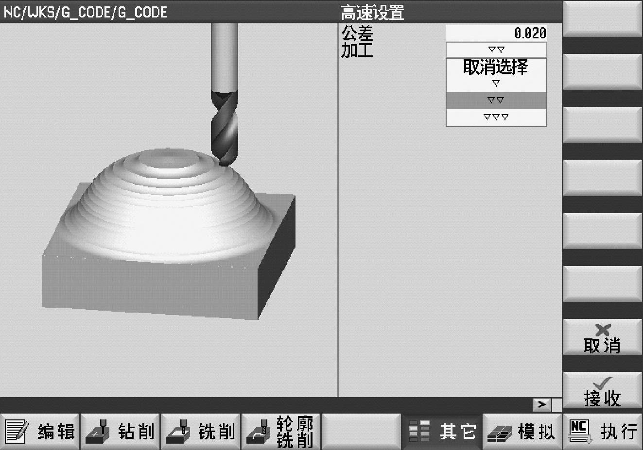 (1)指令功能 模具制造加工中不仅要求有较快的加工速度,而且对工件轮廓型面精度和表面粗糙度也有严格要求。实践中人们认识到模具加工程序的完善和优化对于加工的效率以及质量尤为重要。目前,多数程序员编制的加工程序都是采用CAM软件生成的由大量微短距离的小线段轨迹指令组成。在使用配置828D数控系统的机床加工中,结合相应的编程指令,例如程序段预读、压缩器功能等,可以实现在最短的加工时间内达到最佳的表面加工质量、最高的加工精确度的完美结合。对于一般的用户,可以使用高速设定(CYCLE832)循环指令,只需要简单设定。轮廓公差和加工方式(粗加工、半精加工、精加工)两个参数,就能够对任意形状平面的加工数据进行预设,在数控系统内置控制软件的帮助下实现最佳加工状态。