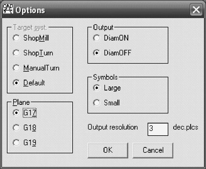 选项设定转换成的孔位程序的类型、加工平面、直径/半径编程、输出的轴位置信息的小数点位数,单击
