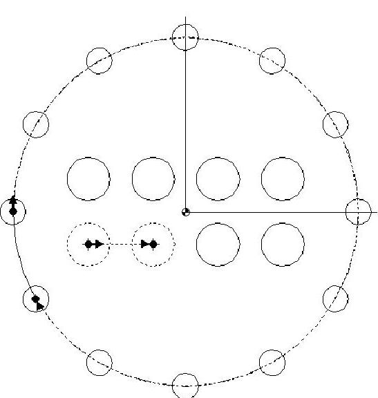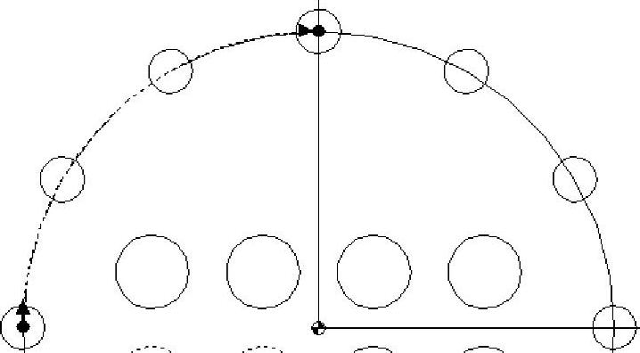 移动光标至与起始孔相邻的孔附近,选择圆弧分布孔的方向,例如顺时针或逆时针方向,单击确认,如图34、图35所示,确定方向的相邻孔显示为绿色;如图36所示,移动光标选择需要加工圆弧上的分布孔,可以逐个选择或全选,单击确认,该孔显示为绿色,在该方向上未选择的孔显示为黄色,如图37所示。确认选择的孔变为虚线显示,如图38所示。
