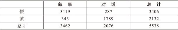 统计方法也有运用得好的,但比较少见。例如李战(1997)对《红楼梦》前80回中“便”和“就”的使用情况进行了统计,不仅把各回分开统计、对话体和叙事体分开统计,而且把不同人物的对话也分开来统计,结果就有了有意思的发现。先看两个统计表(表2、表3)。