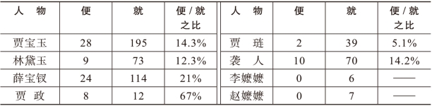 表2显示,“便”和“就”在叙事部分和对话部分的出现数量正好相反,对话中“就”的数量是“便”的约6倍,而叙事部分则“便”是“就”的近10倍;如果只看全书的出现总数,则“便”比“就”多出1000多例,这显然不能反映口语的真相,口语的实际情况理应主要看对话部分。表3对不同人物的对话分别进行了统计,更有意思(原文统计了20个人物的数据,这里仅选取其中8位):上层人物、封建卫道士贾政的对话中,“便”和“就”之比高达67%;而不识字的底层人物李嬷嬷和赵嬷嬷说话时都只用“就”,根本不说“便”,这才是当时老百姓日常口语的真实反映!据此我们可以做出推断,在当时的实际口语中,“就”对“便”的替换已经基本完成。其余人物对话中这两个词的使用情况也值得细细玩味,从中可以看出作者用词的匠心。