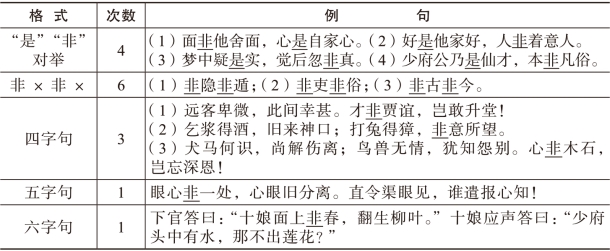 不难看出,这些“非”都属于传统的文言用法,在具体文句中由于字数的限制无一可以改成“不是”。所以“非”的数量虽然是“不是”的三倍,但是这未必反映口语的真实面貌。《游仙窟》一共一万余字,系词“是”用了多达29次,由此反观5例“不是”,我们可以推测,在张文成时代的口语里“不是”也已经发展成熟了。