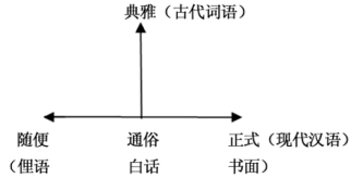 不过冯胜利先生对语体的分类有不同的看法,他主要从“调距”的角度把语体分为“俗常体、正式体、庄典体”[3]三大类,请看他给出的两个示意图(图1、图2)。