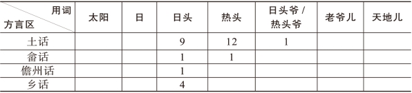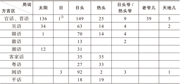 说明:①“太阳”类包括:太阳、太阳包、太阳地儿、太影、太阳佛、太阳菩萨、阳婆、阳窝=。