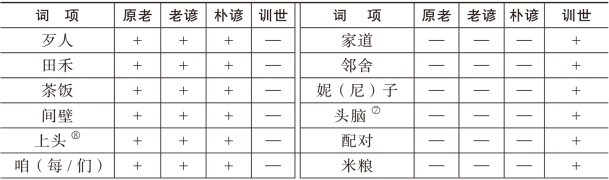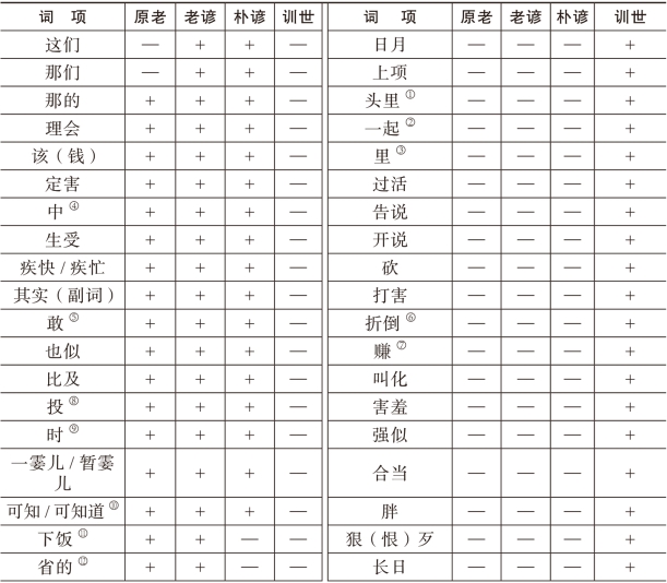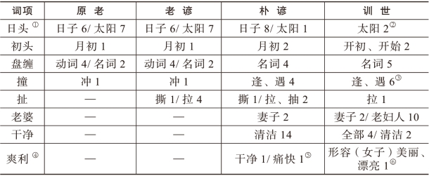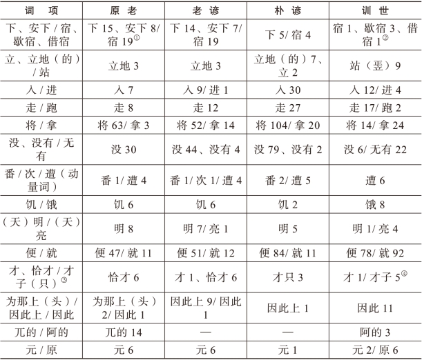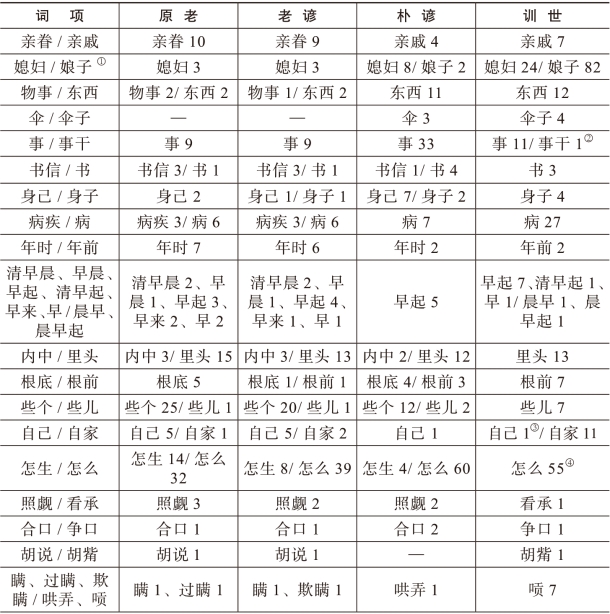 三书存在差异的词数量不少,下面三个表所列的只是初步搜集到的一部分,全面的调查尚需时日。为了便于比较,《原本老乞大》(简称《原老》)也列入。下面行文中有时使用代号来指称这四种书:A=原老,B=老谚,C=朴谚,D=训世。为了保持语料的同质性,《训世》的数据仅取白话部分,不包括文言部分。另外,《训世》中有一些可能是受母语干扰而产生的不规范用词,如“妖怪”(义同“奇怪”)、“地垈(垡)”、“……道的(人/地方)”等(汪维辉 2003),本文不涉及。