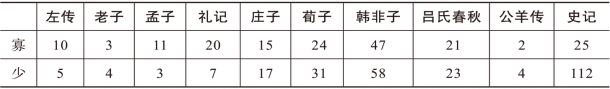 在传世的儒家经典“十三经”中,只用“寡”而不用“少”的有《周易》(6例)、《尚书》(1例)、《周礼》(19例)、《论语》(10例)、《尔雅》(2例)、《孝经》(1例),只用“少”而不用“寡”的则有《诗经》(1例)、《仪礼》(1例)、《穀梁传》(3例)。“少”取代“寡”的竞争,至战国后期达到高潮,到《史记》的时代,大概已基本完成。请看表1这组统计数据。