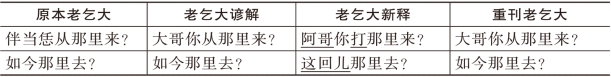 郑光(2004:5)指出:“笔者在拙稿(2001)里把现在流传着的《老乞大》整理为四种。首先是把元代汉儿语言作为教材的《原本老乞大》(1346 年左右编写),其次是成宗时期汉人葛贵等把《原本老乞大》用明代北京官话加以校正的《删改老乞大》(1483 年修订)。还有一个是到了朝鲜英祖时期金昌祚、边宪用清代官话重新加以解释的《老乞大新释》(1761 年新释)。后来认为这个版本使用的是过于低俗的语言。到了正祖时期,李洙等人重新用雅语加以修订,出版了《重刊老乞大》(1795 年重刊)。”李泰洙(2003:1)有类似的看法:“《老乞大新释》和《重刊老乞大》只相差34年,二书在语言上没有什么根本的不同,其中的差异主要反映修改者文字风格的不同。”汪维辉(2005:157)也曾推测,“也许是正祖觉得前代英祖时改编的《新释》太过口语化,有失雅正,所以才有必要重修,因为在短短的三十几年间语言的变化不至于大到要把全书再重改一遍。”以上是目前比较通行的看法,但都没有具体论证。