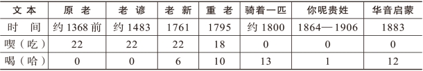《骑》中表示“drink”义的动词用“哈”。根据《朴通事新释谚解》《重刊老乞大谚解》《你》《华》中的谚文注音,我们确定“哈”与“喝”在当时口语中的读音相同。吕传峰(2006)曾考察“喝”在四种《老乞大》中的使用情况,这里我们将四种《老乞大》以及《骑》《你》《华》共七种文本中表示“drink”的“喫(吃)”与“喝(哈)”放在一起做一个比较。[87]