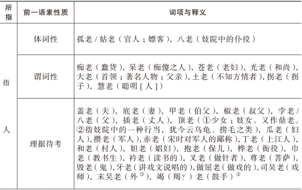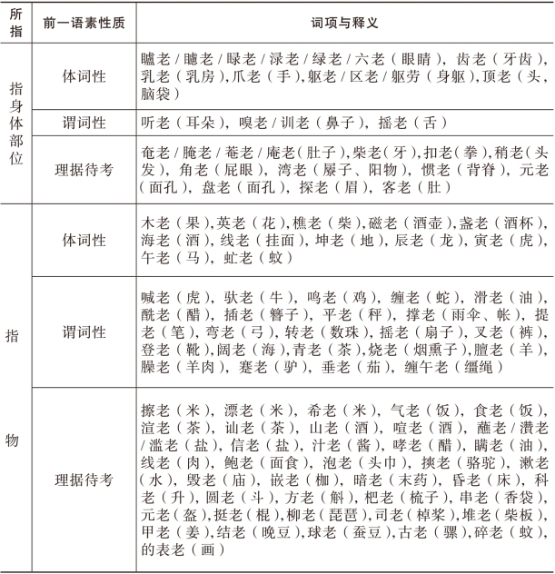 综合前人研究和实际语例来看,“~老”系列词均为名词,根据所指对象大致可以分成指人、指身体部位和指物三类。从构词成分看,第一个语素可以是体词性的,也可以是谓词性的,有些则理据待考。现将迄今所知的“~老”系列词成员按所指和前一语素的性质列为表1。[2]