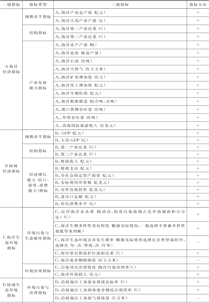 A海洋经济指标包括规模水平指标,涵盖A11海洋产业总产值(亿元)、A12海洋人均产业产值(元)两个二级指标;结构指标,涵盖A21海洋第二产业比重(%)、A22海洋第三产业比重(%)两个二级指标;产业发展能力指标,涵盖A31海洋水产产量(吨)、A32海洋盐业(原盐产量)、A33海洋石油(万吨)、A34海洋天然气(万立方米)、A35海洋矿业增加值(万元)、A36海洋化工增加值(亿元)、A37海洋生物医药(亿元)、A38海洋船舶修造(综合吨,万吨)、A39港口货物吞吐量(万吨)、A310外贸吞吐量(万吨)、A311滨海国际旅游收入(万美元)11个二级指标。