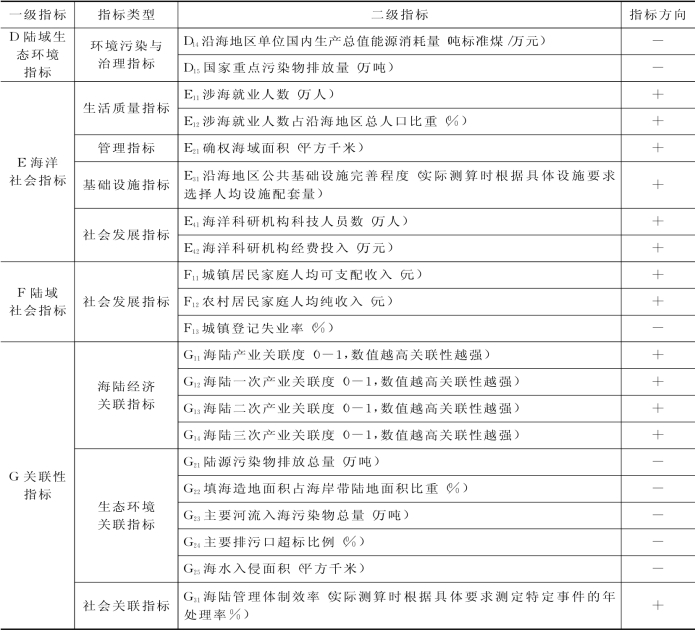 G关联性指标旨在反映海陆各子系统要素的联系状况:包括海陆经济关联指标,涵盖G11海陆产业关联度、G12海陆一次产业关联度、G13海陆二次产业关联度、G14海陆三次产业关联度;生态环境关联指标,涵盖G21陆源污染物排放总量、G22填海造地面积占海岸带陆地面积比重(%)、G23主要河流入海污染物总量(万吨)、G24主要排污口超标比例(%)、G25海水入侵面积;社会关联指标,涵盖G31海陆管理体制效率等。