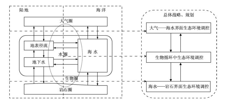 因此,制定海陆生态系统统筹战略,要关注海洋生态子系统和陆地生态子系统之间的相互作用。在大气—海水界面,从蒸发、降水过程中进行生态环境监控;在海水—岩石圈界面,关注侵蚀、沉积过程中的生态环境;而最关键的环节是海陆水体交换过程中的生态环境控制,在防治海洋污染和生态破坏的同时,控制陆地生态环境威胁通过水循环和大气循环带入海洋中,以及海水对地下水的侵蚀。加强沿海动植物资源的保护,控制生物循环过程中对生态环境的影响;同时,发挥海洋对陆地生态环境的调控作用,如通过海水淡化等技术手段,改善陆地生态缺水状况。
