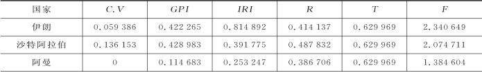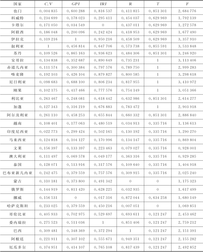 式中,GPIi是指石油输出国家i的全球和平指数(Global Peace Index,GPI),以英国经济学人信息社(Economist Intelligence Unit)的专家小组所颁布的2010年数据为准;IRIi是指石油输出国家i的投资风险指数,以《2011海外国家(地区)直接投资风险排行榜》的数据为依据(表3-3、表3-4)。