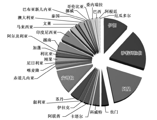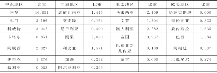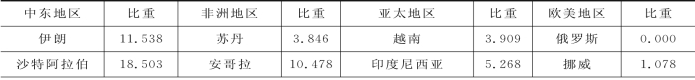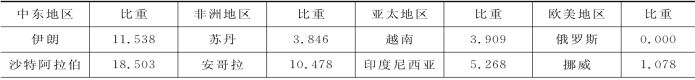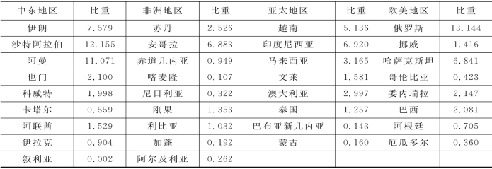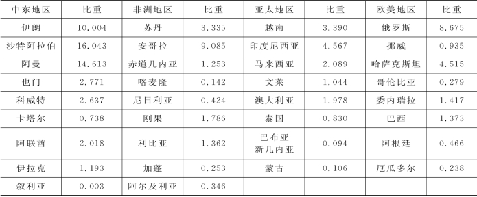 由此形成优化之后的主要石油输出国家进口份额如图3-12、表3-10所示。从进口路径选择来看,石油进口的主要路径也拓展到五条,其中三条为陆路通道(中—俄;中—巴—伊;中—哈),两条为海上通道(中—中东;中—拉美);在份额比重上,中东地区的伊朗、沙特阿拉伯、阿曼,陆路邻国俄罗斯、哈萨克斯坦,非洲地区的安哥拉、苏丹,拉美的委内瑞拉、巴西,以及东南亚地区的印度尼西亚和越南,都占了较高的比重,其来源更趋于多元化。