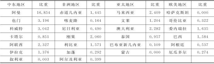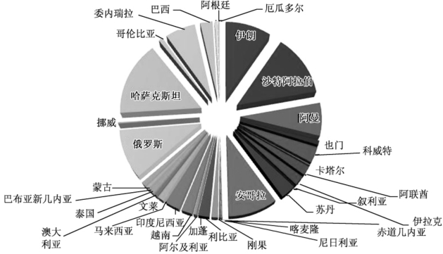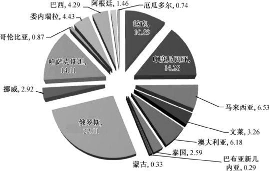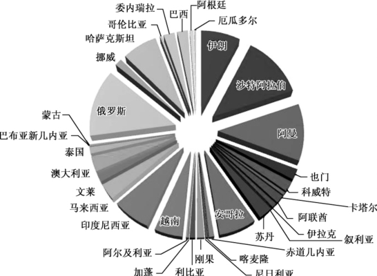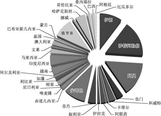 由此可见,中东和西非地区仍然是重要的石油进口来源地,在海路不能完全通达的情形下,从沙特阿拉伯、阿曼、伊朗等国进口石油的比重仍然分别占到了全部份额的12.155%、11.071%和7.579%;俄罗斯、哈萨克斯坦是重要的陆路通道,在马六甲海峡受到干扰、海路不畅的情形下,俄罗斯的石油进口份额达到了13.144%,哈萨克斯坦的比重也达到了6.841%,两者之和占了近20%。印度尼西亚、越南、马来西亚等东南亚国家由于地理上的邻近,其石油供给的重要性也开始显现,三国分别占了全部份额的6.920%、5.136%和3.165%(图3-8)。