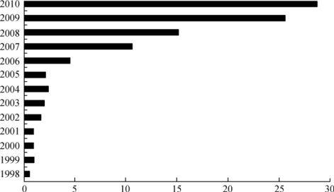图3-11 1998—2010年中国从蒙古国进口石油总量(万吨)