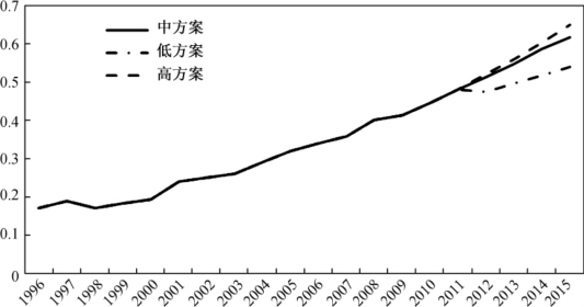 通过当前海陆经济协调度演变趋势,对海陆经济系统运行协调度进行预测,分别采用拟合度较高的二次多项式、一元线性回归以及指数回归等方法,得到不同预测方法下的海陆经济协调度预测值,分为高、中、低三个方案(图4-12)。到2015年,我国海陆经济系统协调度最高值可达到0.650 2,处于较高协调状态;中间值为0.617 5,处于协调性较好状态;低方案值为0.539 5,接近较为协调的状态。从近期的政策来看(表4-7),随着“十二五”对海洋经济的高度重视,各省市海洋经济区的成立以及相关政策制度及规划的出台,行政上的权力重组(2013年初重组国家海洋局,扩大其职权),对海洋经济的大力支持,这使得未来海陆经济协调发展呈现指数增长的态势是有可能实现的。