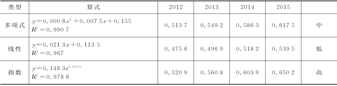 表4-7 不同预测方法下的海陆经济协调度预测值