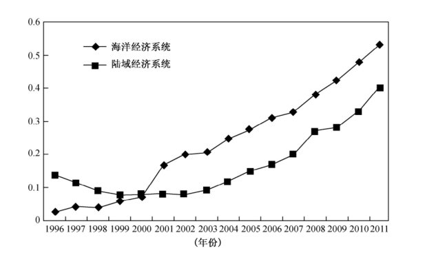 从图4-10可以看出,海陆经济系统运行状态大体上呈逐渐增长的态势,陆域经济在1996—2000年增长较为平缓,而2000年之后增长速度加快,这反映出我国经济在经过金融危机的冲击后,开始加速发展;海洋经济在1996—1998年呈下降态势,在1999—2002年间缓慢发展,这反映出我国在20世纪90年代末至21世纪前对海洋经济的忽视,在刚进入21世纪时,没有跟上国民经济增长的步伐;而2003年之后,随着国家对海洋经济的日渐重视,海洋经济也进入了快速发展的轨道,与陆域经济子系统保持着旗鼓相当的增长速度。