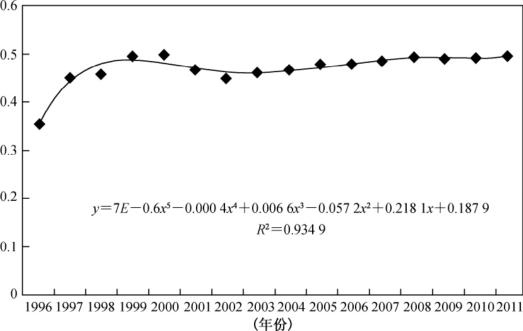 通过计算得出1996—2011年我国海陆经济系统耦合度值(表4-5),对其结果进行拟合后(图4-11)发现,海陆经济系统协调度的演变呈现一种阻尼振动的态势,即任何振动系统在振动中,由于外界作用或系统本身固有的原因,引起的振动幅度逐渐下降的特性。在最初的运动中,即1996—2000年这一段时期,其系统耦合度波动较大,而此后波动逐渐变小,不断趋于稳定,并呈现缓慢上升的趋势。从2000年起,耦合度缓慢上升,说明海洋经济开始被关注,通过一系列系统的规划以及相关政策,海洋经济在国民经济中的地位及其与陆域经济系统的相互关系逐渐明晰,系统的运行状态得到有序地控制,促使这一时期两个子系统的相互影响逐渐稳定在一个阈值中,并在系统运动中不断提升其耦合状态。